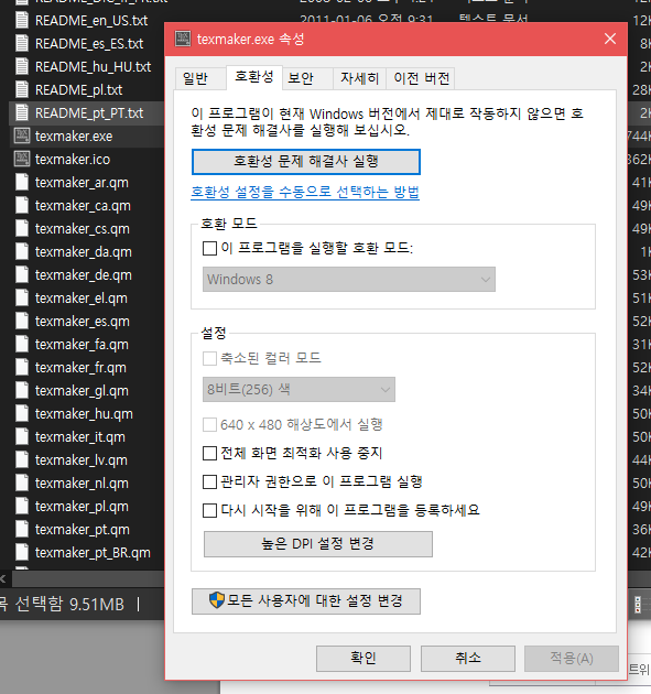 먼저 Texmaker 종료 한 후, 설치된 곳에 가서 실행 파일에 마우스 우클릭 후 속성 창을 연다.