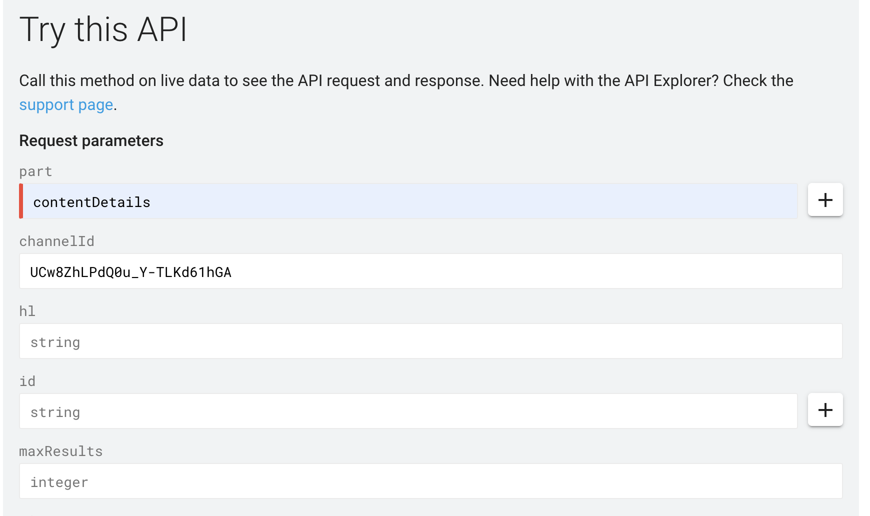 여기에 필수적으로 채워야할 내용은 part, channelId 두 가지다. 파트는 플레이 리스트의 자세한 정보를 얻어오기 위해서 그냥 contentDetails 를 써넣고, 채널 ID는 유튜브 채널 주소의 www.youtube.com/channel/ 뒤에 있는 채널 아이디를 가져와서 넣는다.