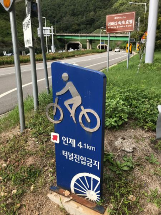 속초로 가는 길엔 언덕도 많았지만 터널도 정말 많았다. 자전차도 차라고는 하지만 차가 쌩쌩 달리는 터널을 나도 함께 달리고 싶진 않았다. 한낮에도 후방 라이트 한 번 안 끄고 달렸지만, 옆을 스치듯 지나가는 차 때문에 겁이 나기 때문이다. 그러던 와중 인제로 가는 길에 자전거는 통과 못 하는 터널이 있었다. 친절하게 우회할 수 있는 길로 안내하는 표지판이 있었는데, 터널은 산을 통과해서 가는 것이지만 그 우회도로는 산을 넘어서 가는 것이다. 이 당시 타던 자전거가 기어비를 아무리 낮추어도 언덕을 앉아서 올라갈 순 없었다. 자전거 안장에서 일어서서 번갈아가며 페달을 밟으니 대퇴사두가 폭발할 것 같은 느낌에 심장이 터질 것 같은 느낌이 들었지만 자전거에서 내려서 끌고 올라가고 싶진 않았기에 멈추진 않았다. 그리고 무엇보다 클릿 신발 신고 아스팔트 언덕을 걸어올라 가면 더 힘들 것 같았기 때문이다. 나 자신과의 자존심 싸움이랄까. ㅎㅎ 스쿼트, 레그 프레스 하던 생각을 하며 열심히 밟아서 겨우 정상까지 올랐다. 이게 둘째 날 라이딩 중에 가장 힘든 때였다.