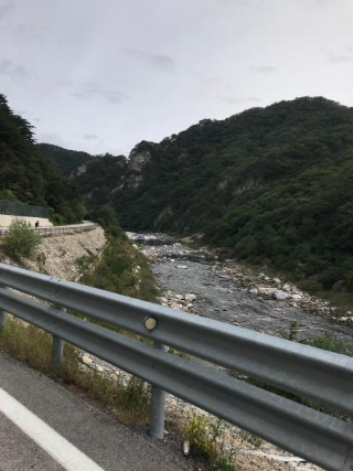 미시령에 가까워오자 강원도의 자연 경관이 더욱 아름답다는 걸 실감하였다. 가을 날씨가 춥지도 덥지도 않고, 날도 맑고, 차가 별로 없는 국도를 달리다 보니 사람들이 붐비는 도시 생활에 지친 마음이 한결 가라앉는 느낌이었다. 자전거로 가는 둥 마는 둥 하며 아름다운 곳이 보일 때마다 자전거에서 내려 사진을 찍고, 친구는 고프로로 영상을 찍어가며 이동했다.
