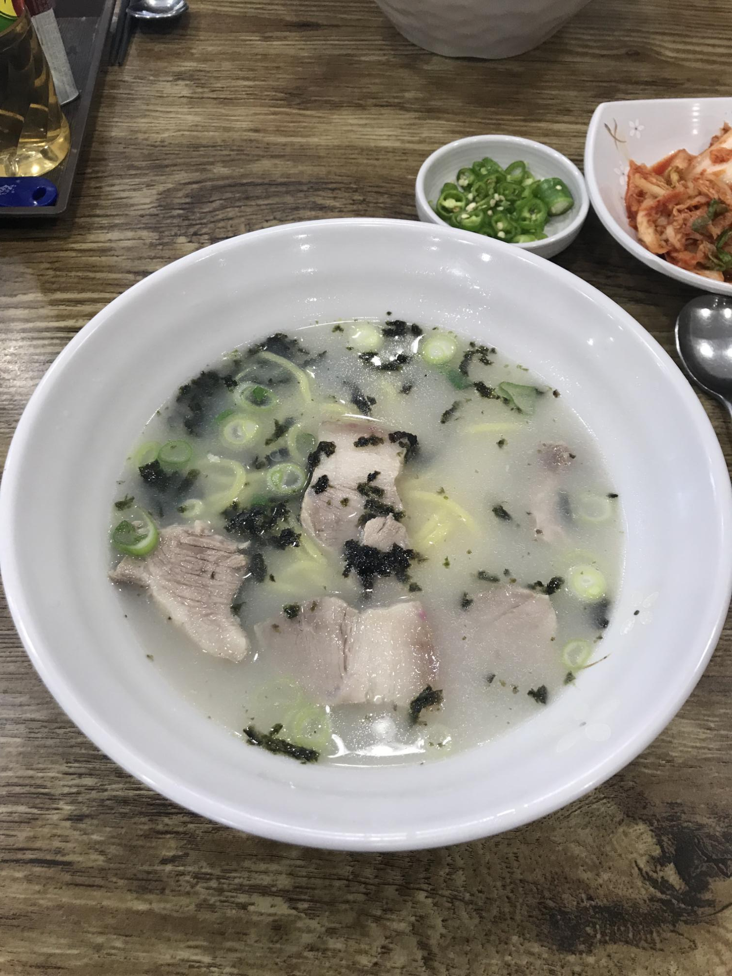 다음 날 학회장에 들렀다가 점심으로 고기 국수를 먹기로 했다. 후배 한 명이 제주에 가기 전부터 올래국수 노래를 불렀는데, 학회장과 멀기 때문에 그 대안으로 그냥 고기 국수 집으로 갔다. 국숫집 이름이 기억이 안 나지만 평일에도 사람이 많았다. 여행객으로 보이진 않고, 그냥 동네 사람들이 많이 온 걸로 보아 맛집으로 확신하고 고기 국수를 시켰다. 국물에 간이 세지 않은 점이 좋았다. 그리고 면발을 만들 때 계란을 많이 넣었던 것인지 면이 맛있었는데, 쫄깃해서 식감도 좋았다. 다만 함께 준 매운 고추를 때려 박았더니 그거 먹고 미각이 둔해져서 다 먹을 때쯤에는 맛을 즐기지 못했다.