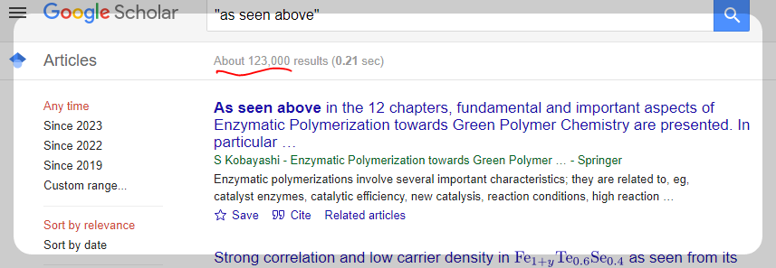 예를 들어 구글 스칼라에서 두 가지 표현을 각각 큰 따옴표 검색하면, "as seen above"가 약 10배 더 많이 쓰이는 걸 볼 수 있습니다. 최근에 저는 이 보다는 "as mentioned before"를 더 많이 쓰긴 합니다.
