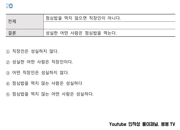 위 문제에는 전제가 하나 빠져 있는데, 결론의 의미론(semantic)이 참(True)이 되려면 2번 "성실한 어떤 사람은 직장인이다"가 필요하다.