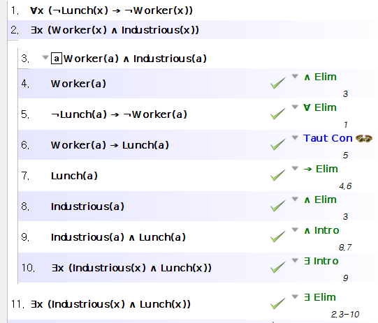 마지막으로 "성실한 어떤 사람은 점심밥을 먹는다."라는 전제가 있을 때(2번 줄), a라는 사람을 가정하면(3-10번 줄), " 성실한 어떤 사람은 점심밥을 먹는다"가 참이라는 점을 알 수 있는 것이다(11번 줄).