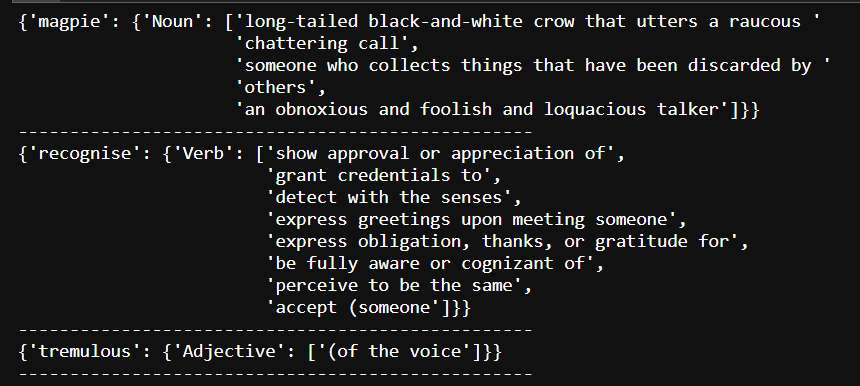 또한 영어 사전에서 단어 뜻을 알아오려면 PyDictionary (https://pypi.org/project/PyDictionary/)를 이용하면 된다.