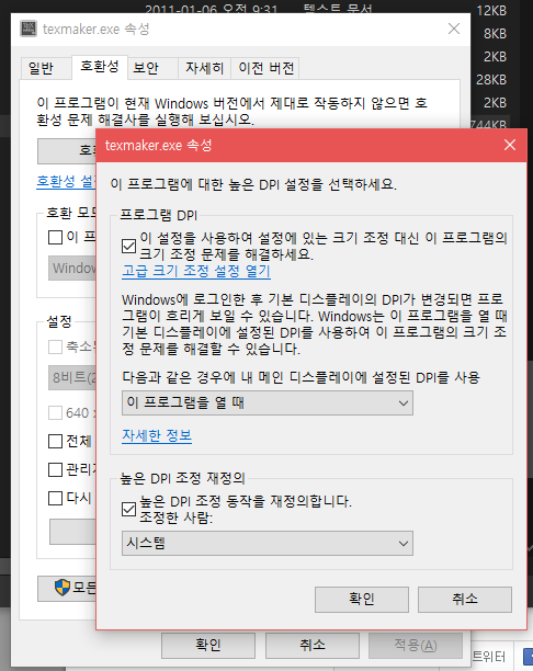 또한 아래 높은 DPI 조정 재정의의 체크박스를 선택하고, 아래 드롭 다운 메뉴에서 "시스템"을 선택한다.
