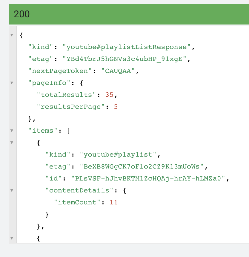 위 예제에서는 다섯개 리스트만 나오지만 다음 페이지 토큰을 사용하면 모든 플레이리스트 영상을 다운로드 가능하다. 예제는 다음에...