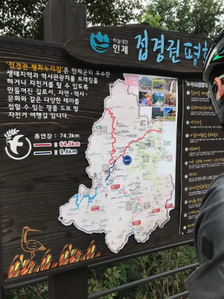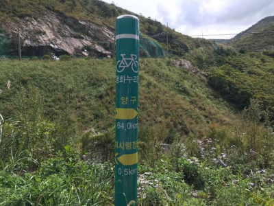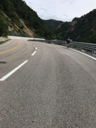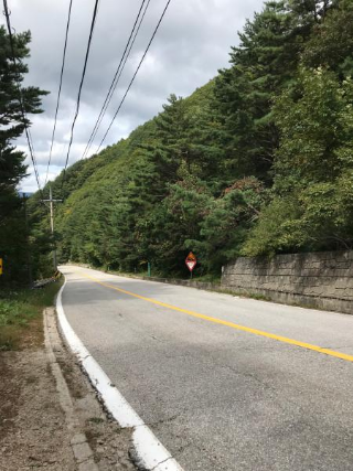 속초로 가는 길엔 언덕도 많았지만 터널도 정말 많았다. 자전차도 차라고는 하지만 차가 쌩쌩 달리는 터널을 나도 함께 달리고 싶진 않았다. 한낮에도 후방 라이트 한 번 안 끄고 달렸지만, 옆을 스치듯 지나가는 차 때문에 겁이 나기 때문이다. 그러던 와중 인제로 가는 길에 자전거는 통과 못 하는 터널이 있었다. 친절하게 우회할 수 있는 길로 안내하는 표지판이 있었는데, 터널은 산을 통과해서 가는 것이지만 그 우회도로는 산을 넘어서 가는 것이다. 이 당시 타던 자전거가 기어비를 아무리 낮추어도 언덕을 앉아서 올라갈 순 없었다. 자전거 안장에서 일어서서 번갈아가며 페달을 밟으니 대퇴사두가 폭발할 것 같은 느낌에 심장이 터질 것 같은 느낌이 들었지만 자전거에서 내려서 끌고 올라가고 싶진 않았기에 멈추진 않았다. 그리고 무엇보다 클릿 신발 신고 아스팔트 언덕을 걸어올라 가면 더 힘들 것 같았기 때문이다. 나 자신과의 자존심 싸움이랄까. ㅎㅎ 스쿼트, 레그 프레스 하던 생각을 하며 열심히 밟아서 겨우 정상까지 올랐다. 이게 둘째 날 라이딩 중에 가장 힘든 때였다.