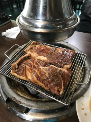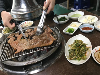 첫날 숙소에서 자고 일어나니 어서 출발해야겠다는 생각이 먼저 들었다. 전날 막걸리와 맥주를 몇리터 마셨지만 별로 힘든 생각은 안 들었다. 설레는 마음과 긴장 때문인 듯하다. 첫날 저녁 식사를 제대로 못한 점이 아쉬워 출발하고 언덕 하나 넘겨서 보인 고깃집에 들어가서 갈비로 아침을 시작하기로 했다. 어제 저 언덕 하나만 더 넘었으면 이걸 먹고 자는 거였는데 하는 점이 아쉬웠다.