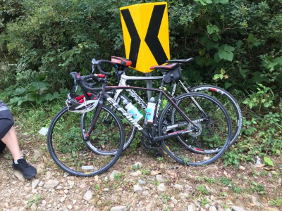 정상에 오르니 반대편에서 산악자전거를 차에 실어 올라오신 어르신들이 보였다. 친구와 자전거를 끌고 올라오는 모습을 못보신 모양인지 로드 자전거는 여길 타고 올라올 수 있냐며 한참 놀라워하셨다. 자전거 끌고 오느라 클릿이 다 닳아버렸는데... 아무튼 정상에서 친구와 기념사진을 여럿 찍으며 언덕을 쌩쌩 내려갔다. 정말 한참을 내려갔다. 길바닥에는 자전거 우선 도로라는 말이 적혀있는 게 인상적이었다. 경사도 세고 커브길도 많아서 브레이크를 신나게 쥐어가며 내려갔다. 자전거 성능이 낮다 보니 브레이크도 쭉쭉 밀리는 느낌이라 내리막이 무서웠다.