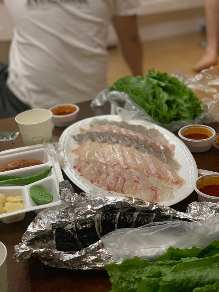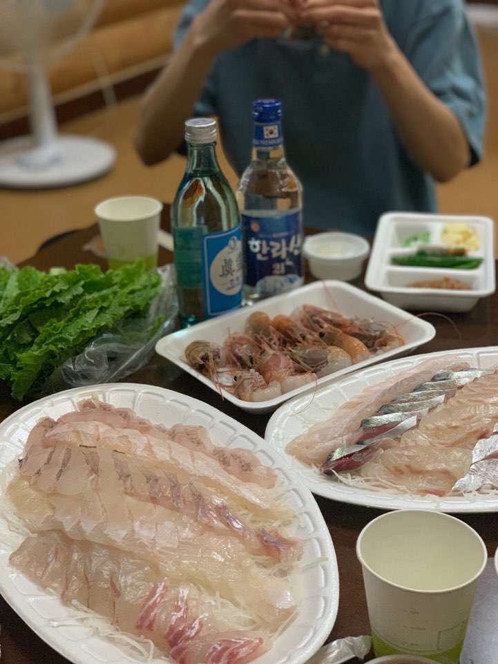 마지막 밤엔 다시 한번 올레 시장에서 회를 사다 먹기로 했다. 회는 다양한 것이 섞여 있어야 맛있지만, 갈치 회와 고등어 회 마니아가 회를 골라왔기에 갈치, 고등어만 잔뜩 있는 회를 먹게 되었다. 회를 먹기 전에 저녁으로 흑돼지 무한 고깃집에서 저녁을 먹었기에 기름에 기름을 먹어서 그런지 금세 질렸다.