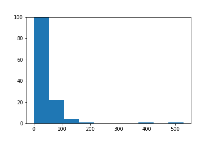 단어 출현 빈도를 히스토그램으로 그려보고 싶다면, 아래와 같은 코드를 이용한다. 반복해서 출현하는 단어가 훨씬 적기 때문에 아래 그림과 같은 형태로 나타난다. 적게 출현한 단어 개수가 너무 많기 때문에 세로 축의 크기를 최대 100으로 제한했다.